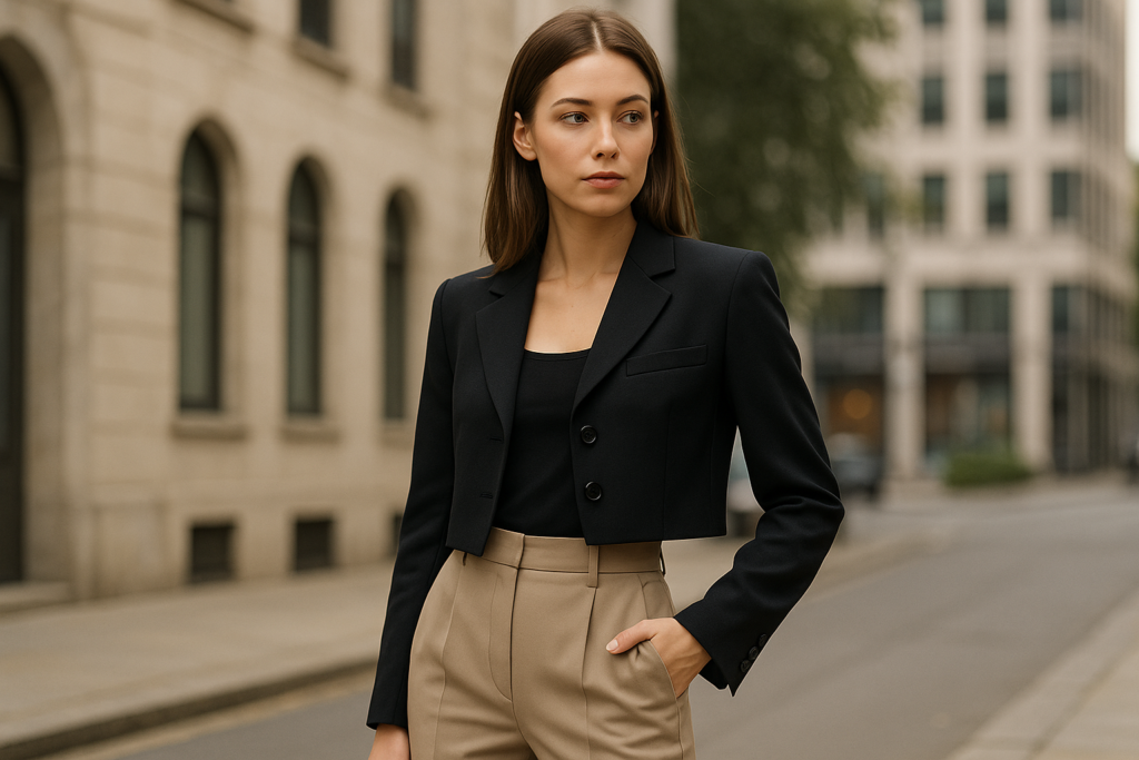 Jednym z najlepszych sposobów na wysmuklenie sylwetki przy użyciu krótkiej marynarki jest odpowiedni dobór spodni. Wysoki stan oraz prosta linia nogawki wzmacniają efekt wydłużenia nóg.