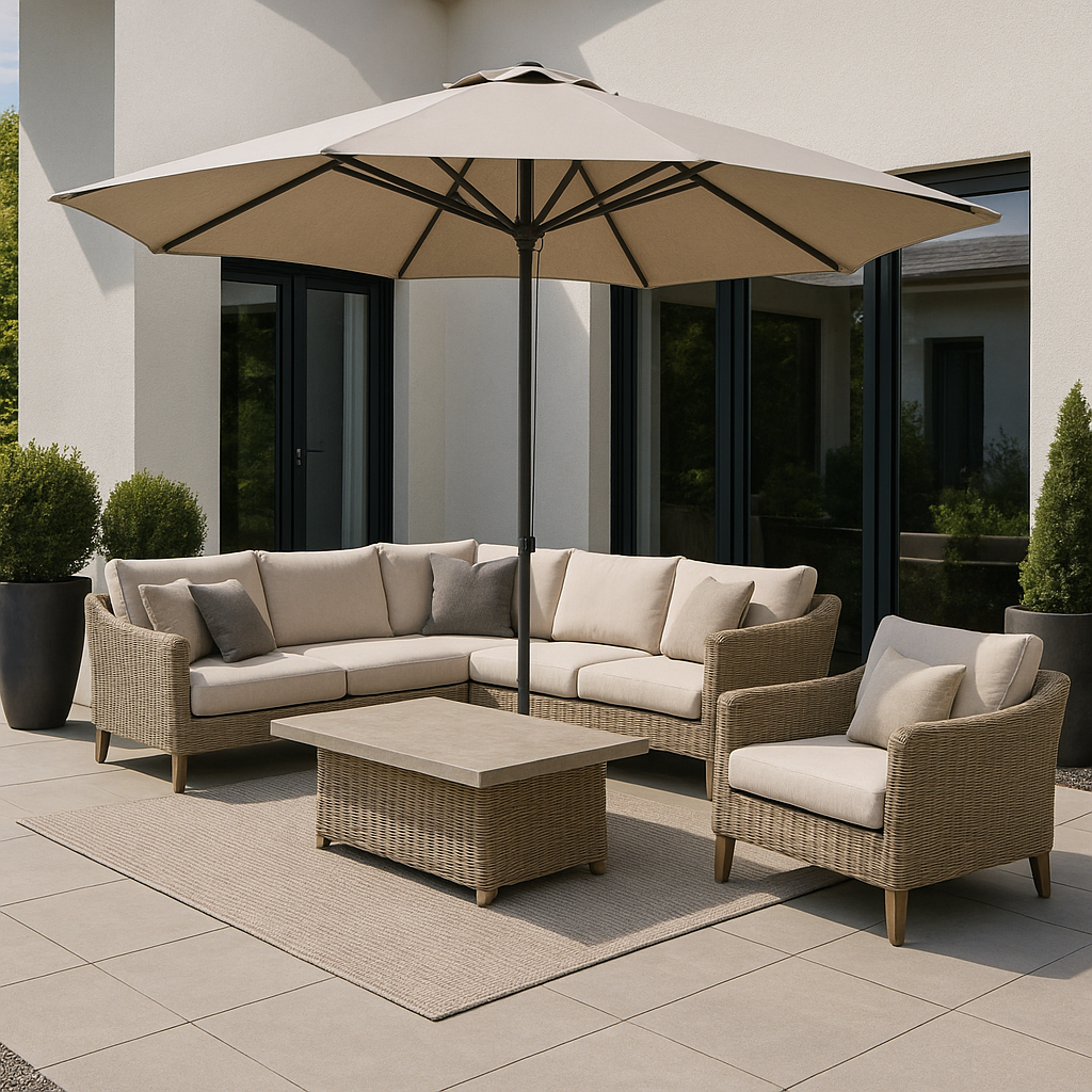 Elegancja stylu modern classic wymaga również dbałości o wygodę. Niezbędnym elementem tarasu są rozwiązania zapewniające ochronę przed słońcem. Dobrym wyborem będzie duży parasol ogrodowy, który harmonijnie wpisuje się w klasyczno-nowoczesną estetykę. Alternatywą są parasole w formie premium, które oprócz funkcjonalności stanowią elegancki element dekoracyjny.